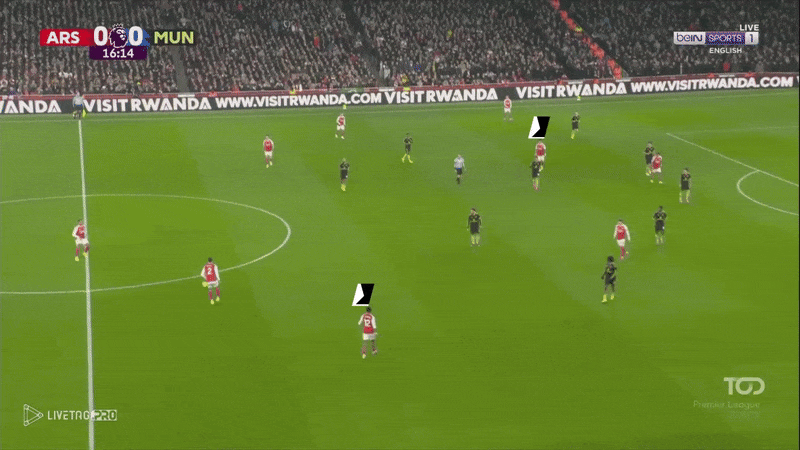 United losing the ball on three occasions but still managing to regain possession, both due to their counter-pressing structure and Arsenal’s limited transition threat.