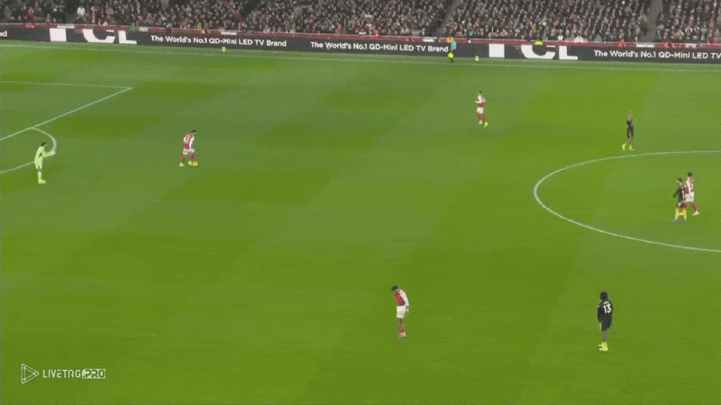 From there, Arsenal looked to activate their wide dynamics. On the right, Timber was pushed into the half-space, where he could combine with Saka, Ødegaard, and Jesus. On the left, Hincapié and Trossard worked higher and wider, looking to deliver crosses into the box.