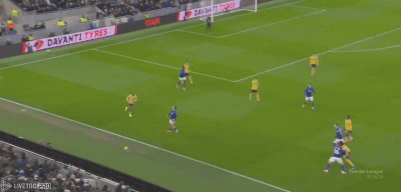 ● Movement to receive: For a midfielder, the ability to be central in build-up play is essential. To do so, movement to consistently offer passing options to teammates is crucial. While Everton are not a side that looks to methodically build out from the back, Garner often finds himself receiving the ball after regains or when contesting and collecting second balls following longer passes.